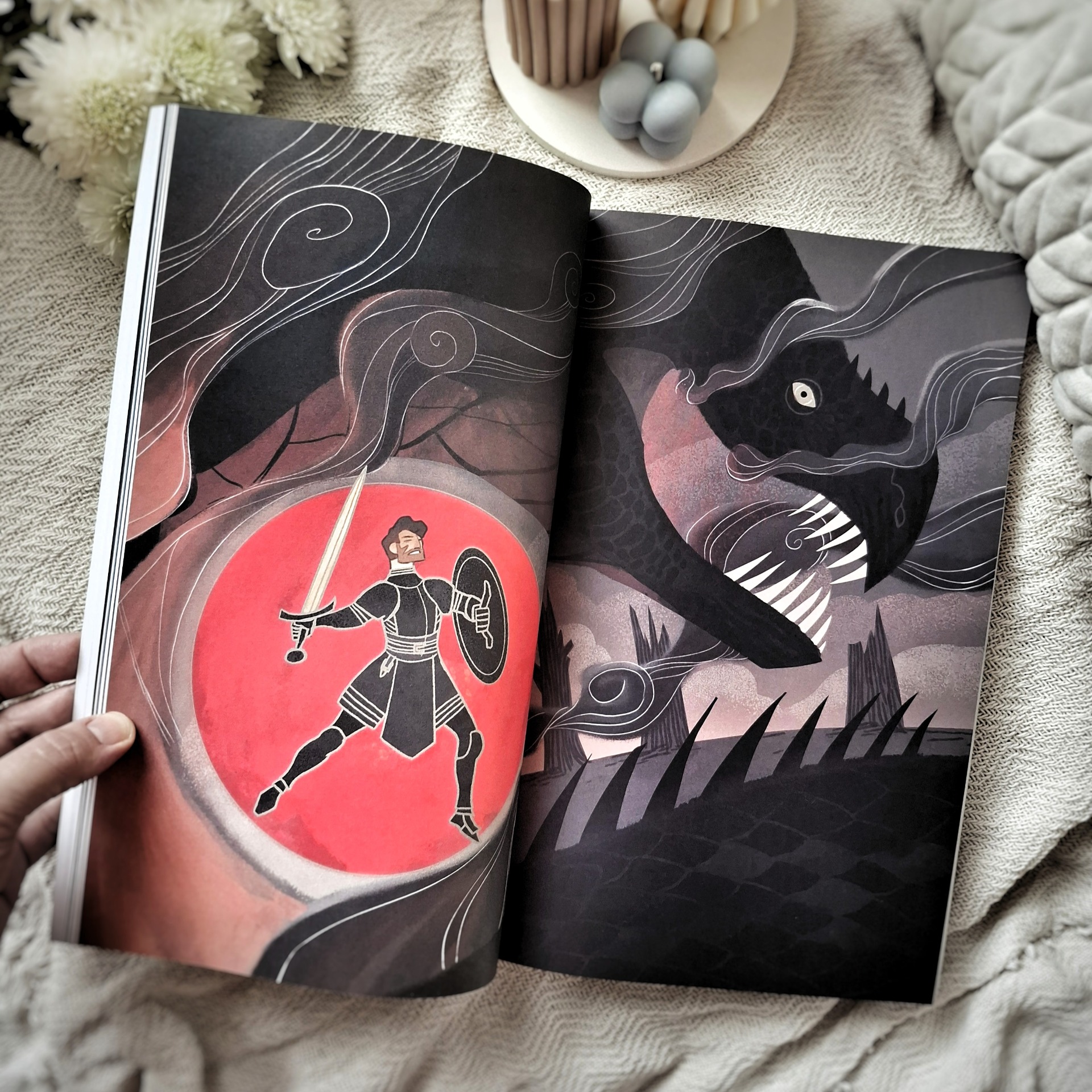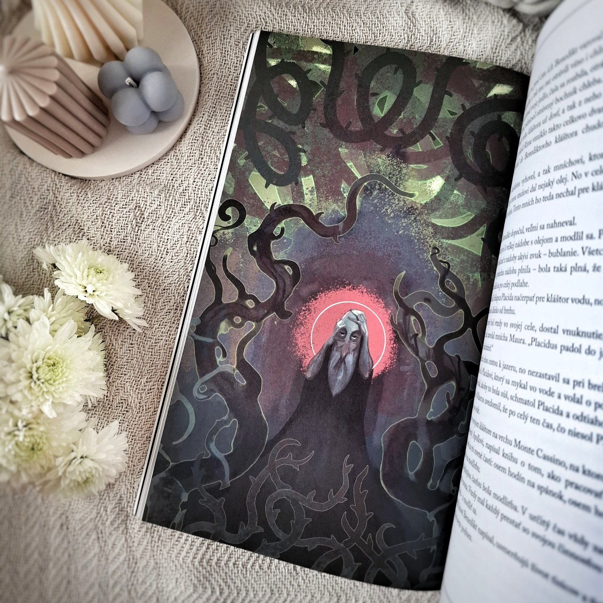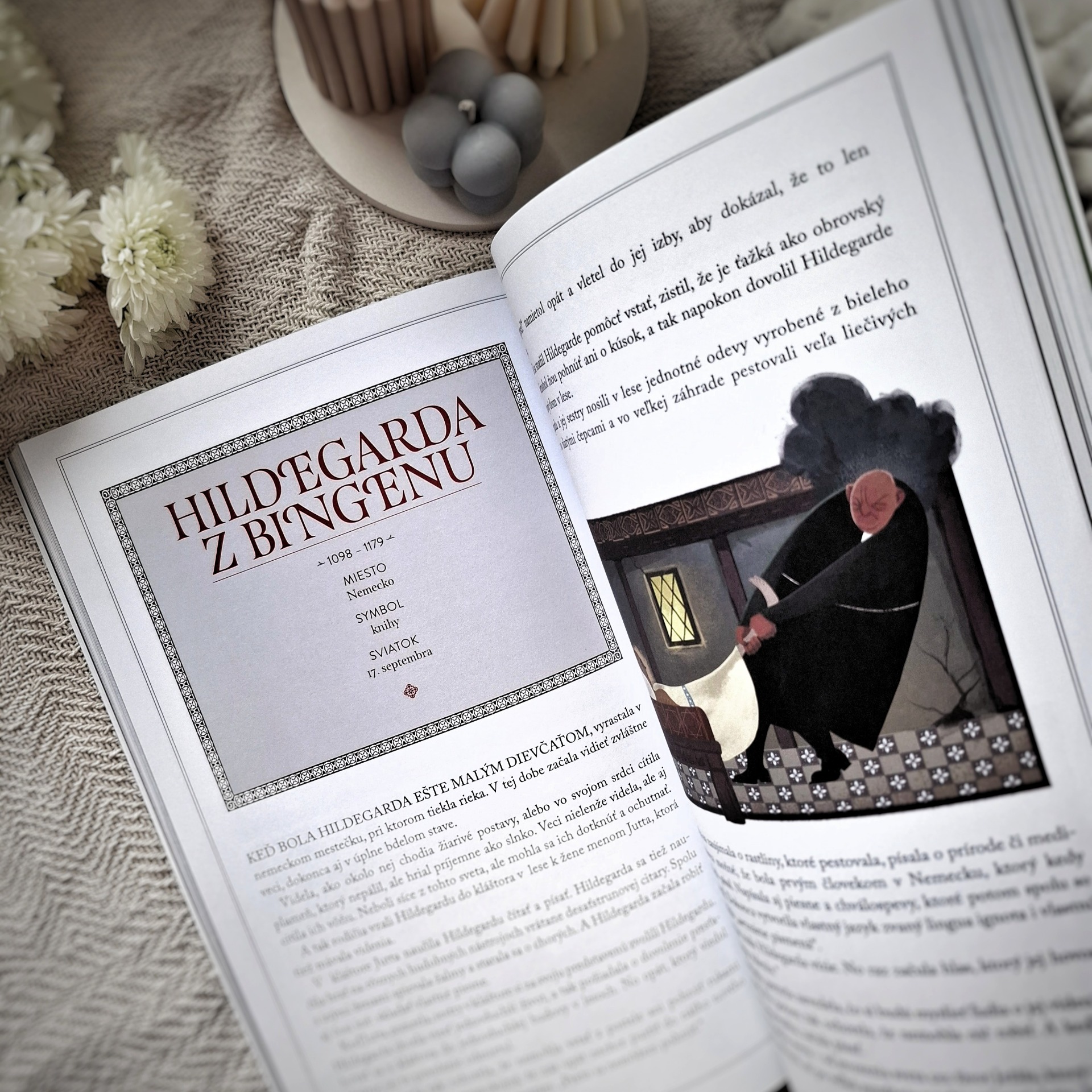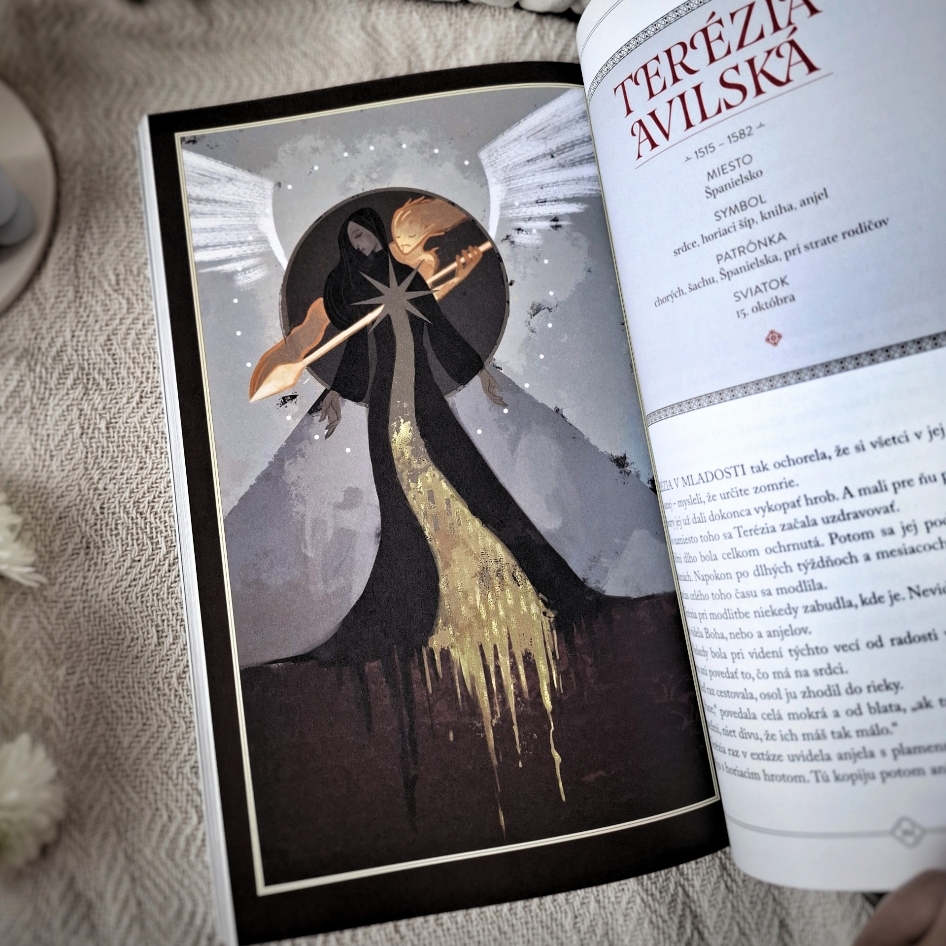 Hneď pod menami jednotlivých svätých nájdete aj základné informácie: rok narodenia a úmrtia, miesto pôsobenia, symboly, čoho alebo koho je daný svätec patrónom a kedy má sviatok. Všetko obohatené o dramatické ilustrácie, ktoré stručným príbehom akoby dodávali hĺbku. Spočiatku na mňa pôsobili príliš temne ale keď som si uvedomila, že nie sú určené pre najmenšie deti (ale skôr pre tie staršie), odrazu som v nich videla oveľa viac a nesmierne ma nadchli 😍.